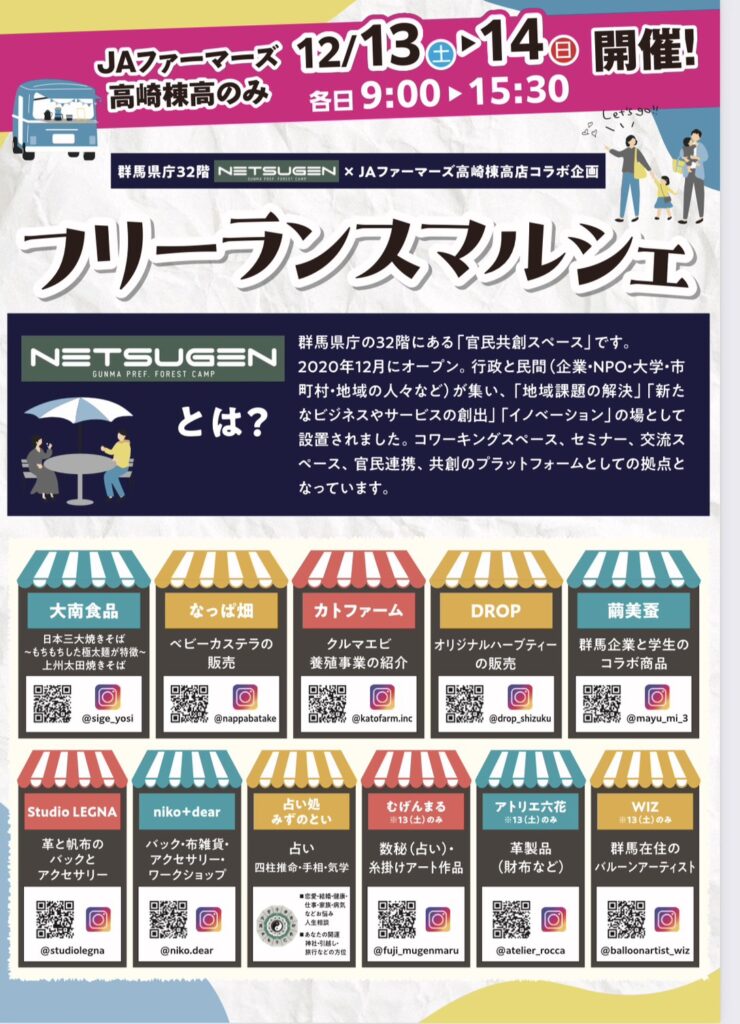 恒例のJAファーマーズ高崎棟高店の『フリーランスマルシェ』が12月13日(土)および14日(日)に開催され、今回も占い処としてブース出店いたします。
